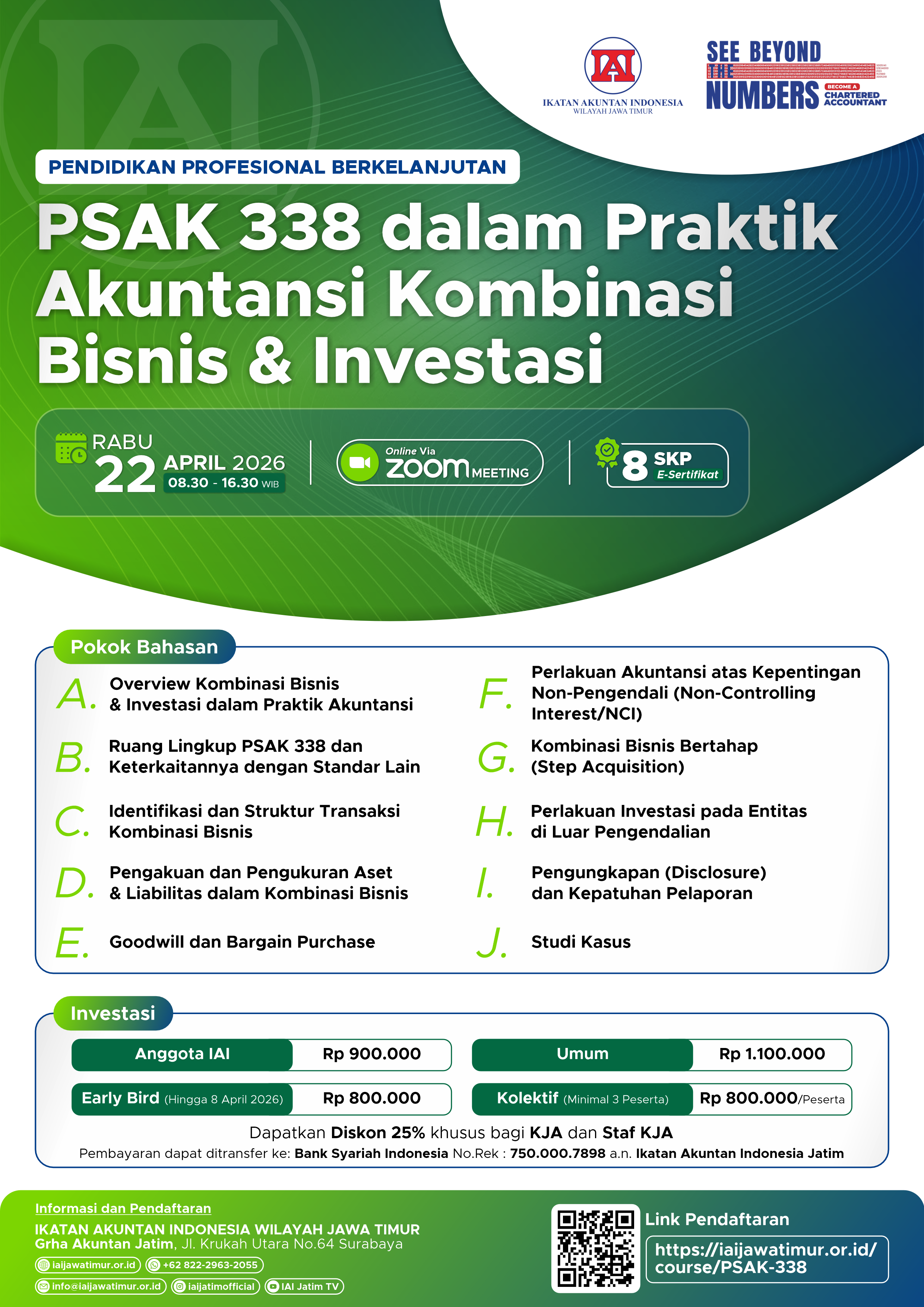 Dalam dunia akuntansi, kombinasi bisnis dan investasi menjadi topik yang sangat penting untuk dipahami, terutama dalam konteks standar akuntansi yang berlaku di Indonesia. PSAK 338, yang mengatur tentang Akuntansi Kombinasi Bisnis, memberikan panduan yang jelas mengenai cara mengakui dan mengukur kombinasi bisnis serta investasi yang terjadi dalam suatu entitas. Pemahaman yang mendalam terhadap PSAK 338 sangat penting bagi para praktisi akuntansi untuk memastikan bahwa laporan keuangan yang disusun menggambarkan kondisi keuangan perusahaan dengan akurat, transparan, dan sesuai dengan regulasi yang berlaku. Kombinasi bisnis dan investasi sering kali melibatkan penggabungan atau akuisisi entitas lain, yang membawa tantangan dalam hal pengakuan aset, liabilitas, dan goodwill yang timbul dari transaksi tersebut. Di samping itu, investasi pada entitas lain yang berada di luar pengendalian perusahaan tetap memerlukan perlakuan akuntansi tertentu sesuai dengan ketentuan standar akuntansi yang berlaku.