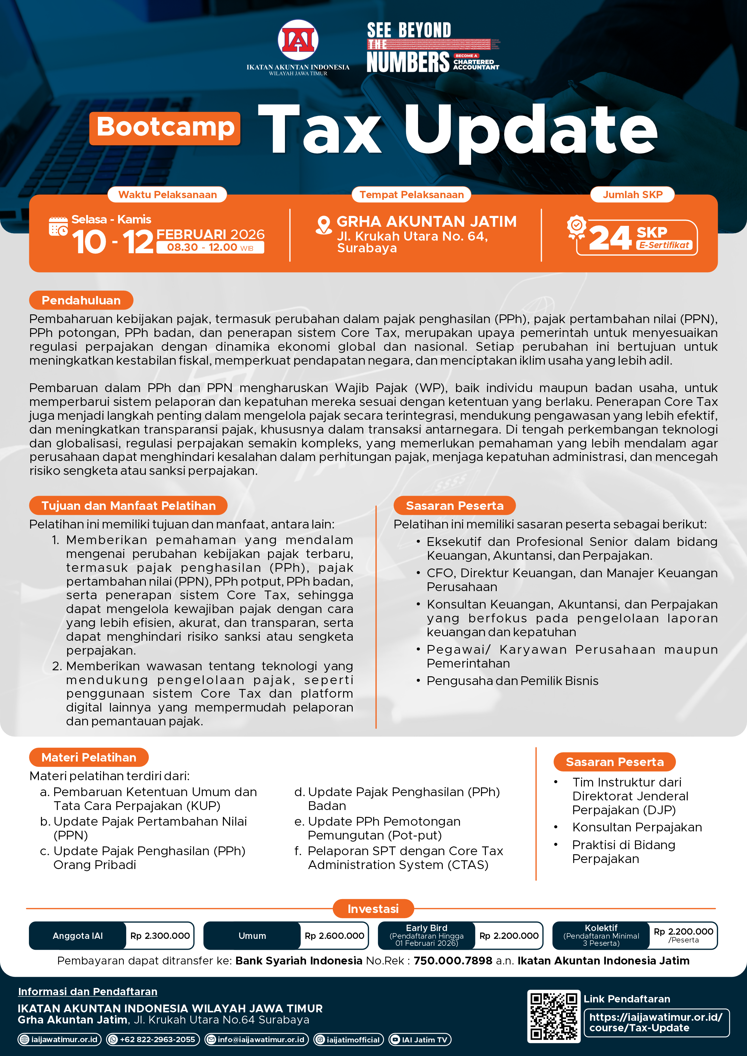 Early Bird (Pendaftaran Hingga 01 Februari 2026) atau Kolektif (Pendaftaran Minimal 3 Peserta): Rp 2.200.000/peserta