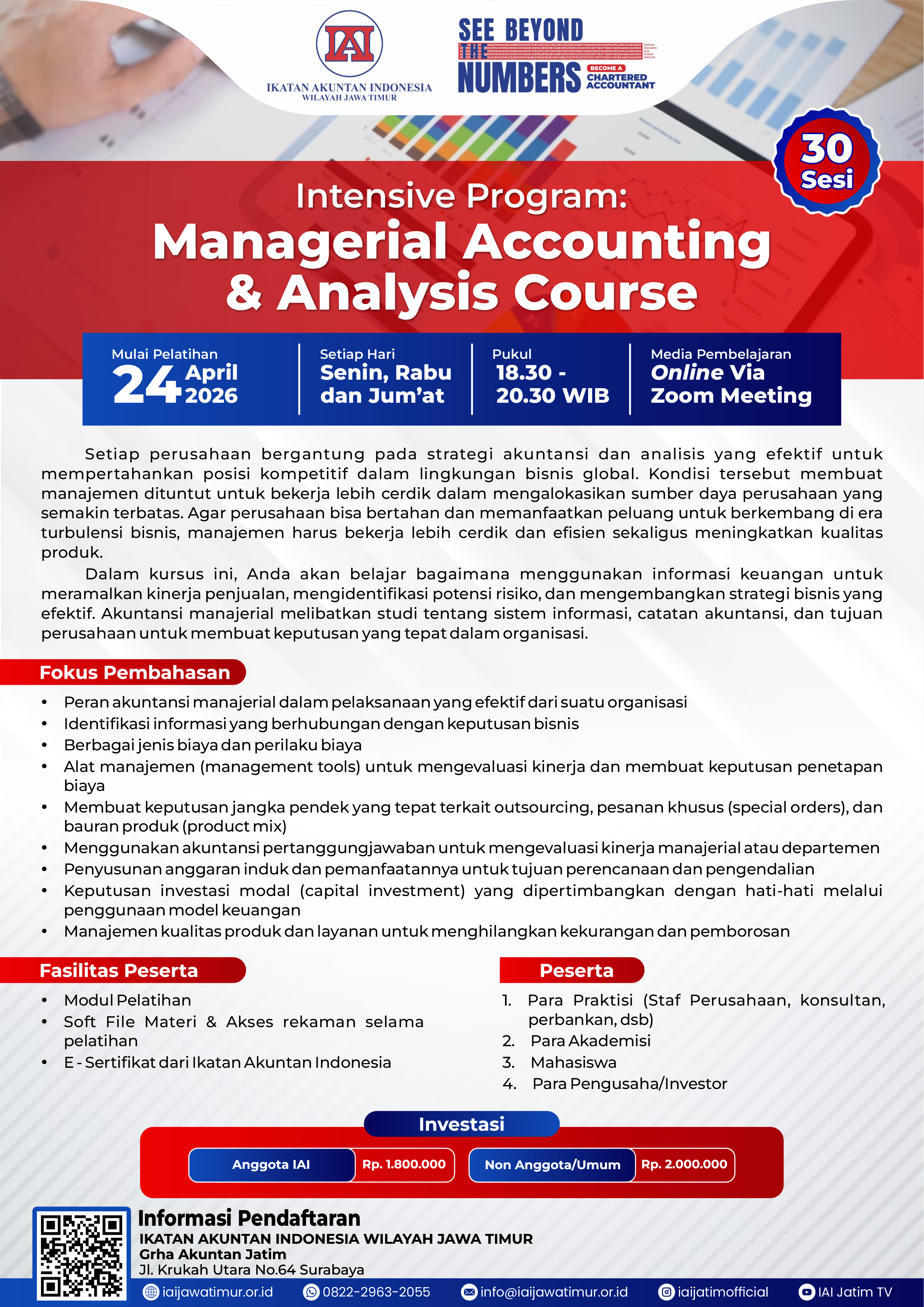 Pelatihan Managerial Accounting & Analysis Course merupakan program profesional yang diselenggarakan oleh Ikatan Akuntan Indonesia Wilayah Jawa Timur untuk meningkatkan pemahaman dan keterampilan praktis peserta dalam menerapkan konsep akuntansi manajerial secara strategis di dunia kerja. Program ini menjadi pilihan tepat bagi akuntan, mahasiswa, maupun praktisi bisnis yang ingin memperkuat kemampuan analisis keuangan, penganggaran, dan pengambilan keputusan manajerial.